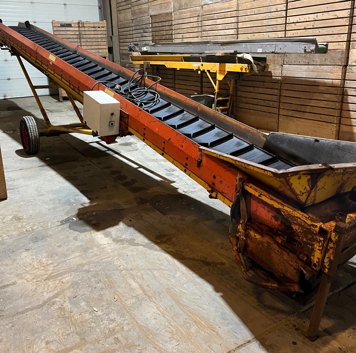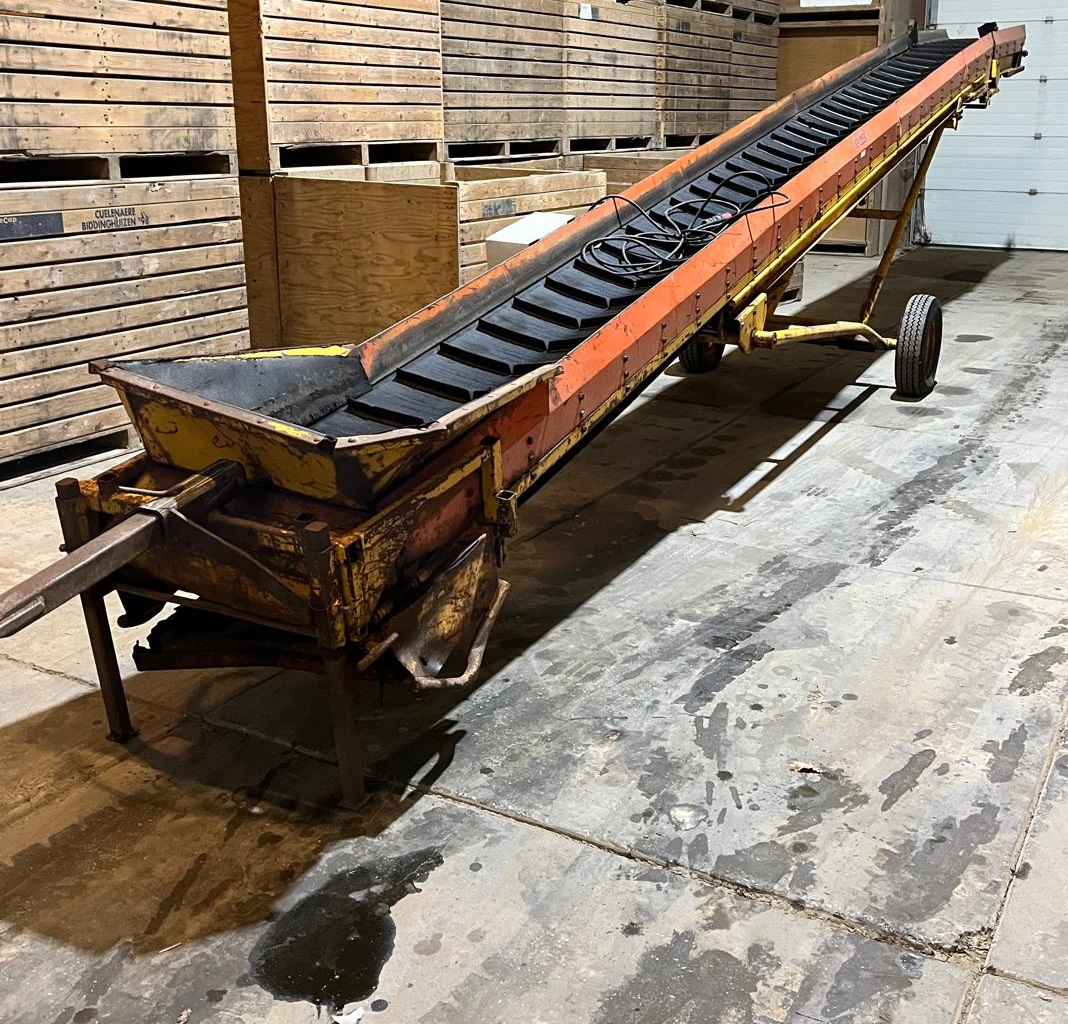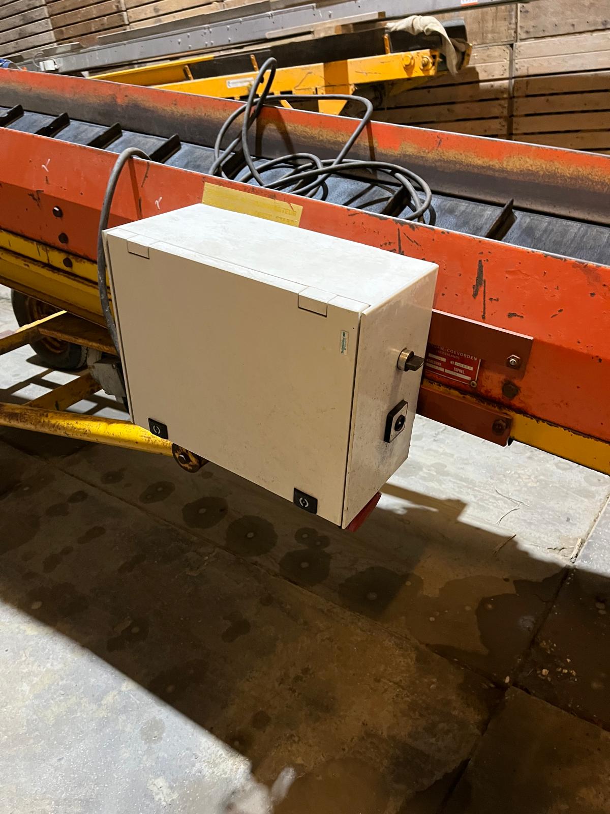 Przenośnik Climax 10 m, szerokość taśmy 65 cm. Dwie prędkości taśmy, elektryczne podnoszenie i opuszczanie.